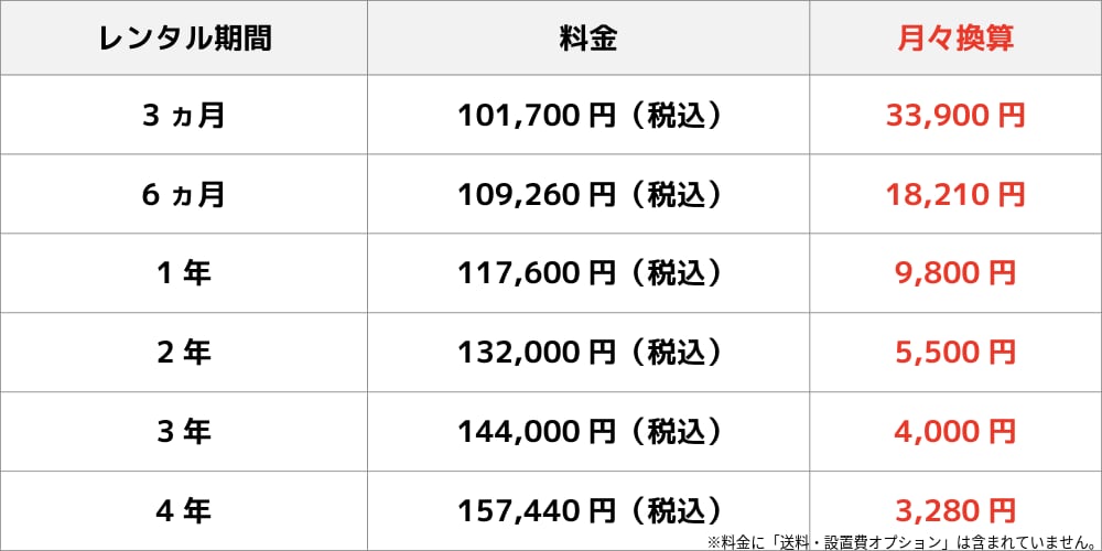 レンタル料金につきましては、下記の早見表をご覧ください。