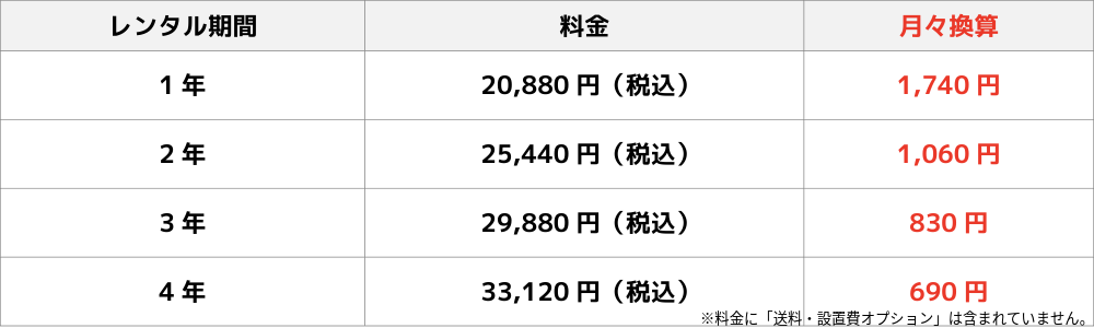 レンタル料金につきましては、下記の早見表をご覧ください。