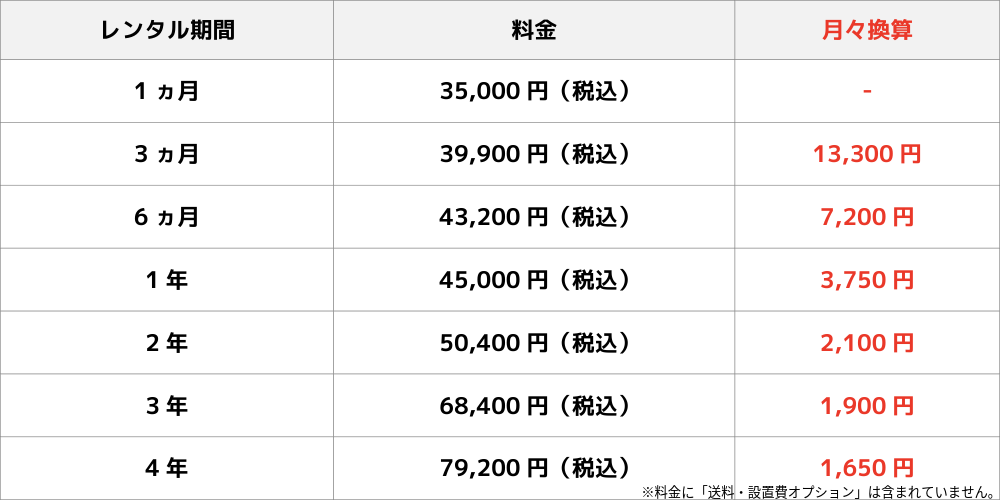 レンタル料金につきましては、下記の早見表をご覧ください。