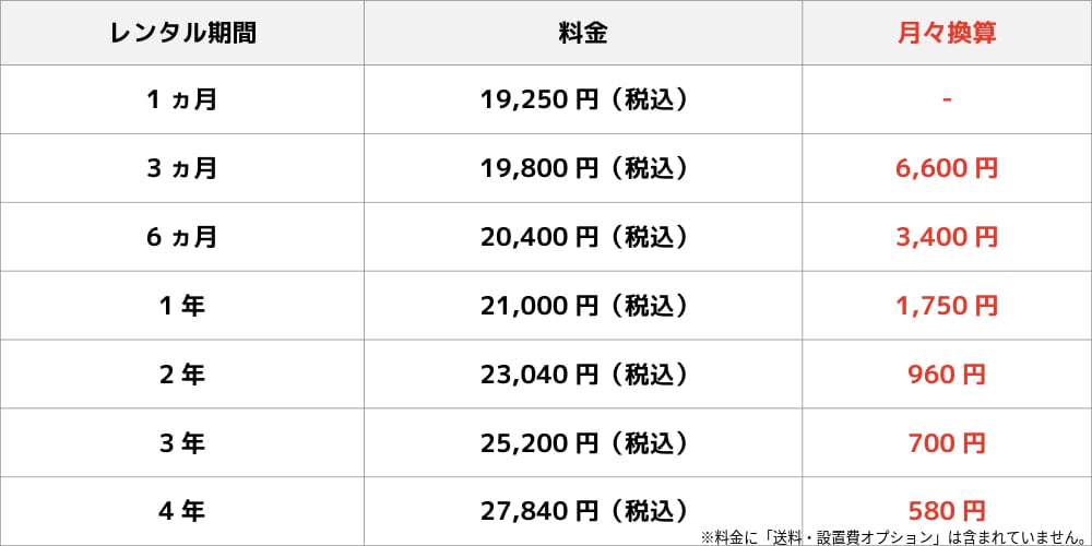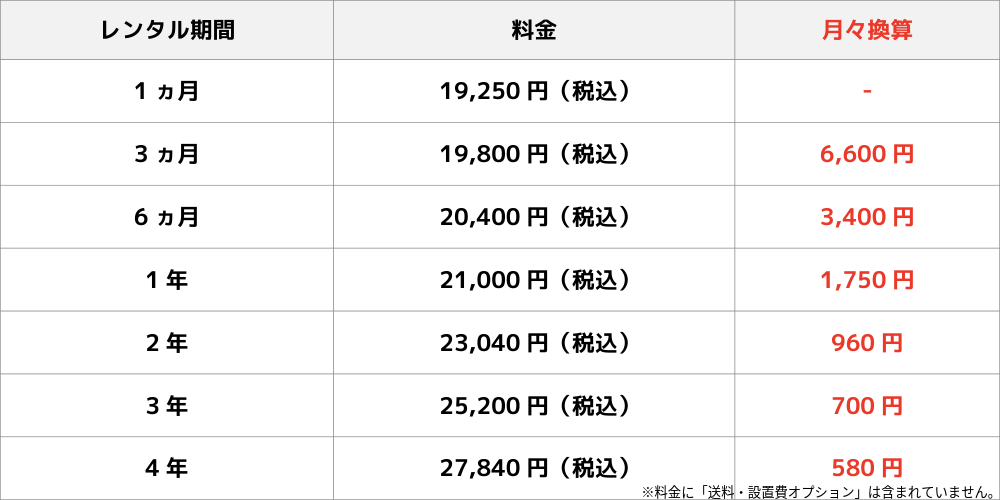 レンタル料金につきましては、下記の早見表をご覧ください。