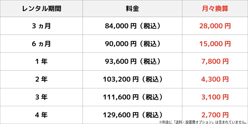 レンタル料金につきましては、下記の早見表をご覧ください。